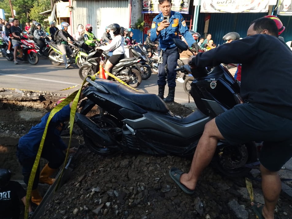 Pemotor Tercebur di Jalan Berlubang Jembatan Sirojudin Tembalang, Evakuasi Berlangsung Dramatis