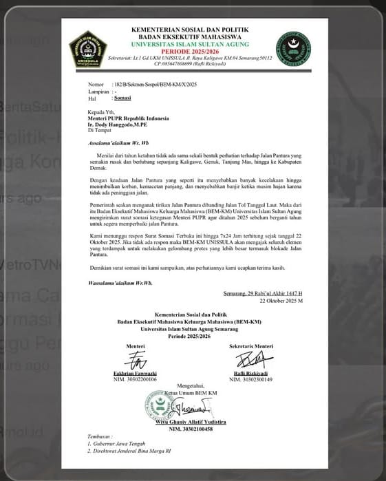 Mereka pun mengirim surat somasi terbuka kepada Menteri PUPR. Dilansir dari akun Instagram bemkmunissula, BEM-KM Unissula 2025 menilai dari tahun ketahun tidak ada sama sekali bentuk perhatian terhadap Jalan Pantura yang semakin rusak dan berlubang sepanjang Kaligawe, Genuk, Tanjung Mas, hingga ke Sayung, Kabupaten Demak.