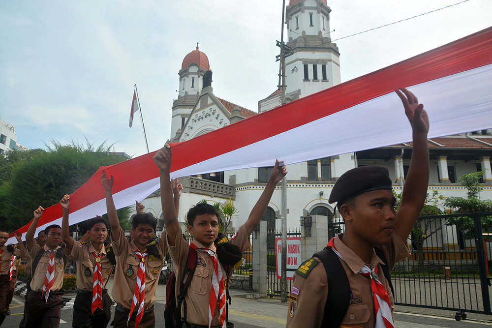 Hari Pahlawan, Ribuan Pelajar hingga Santri di Semarang Bentangkan Bendera Merah Putih 1.945 Meter