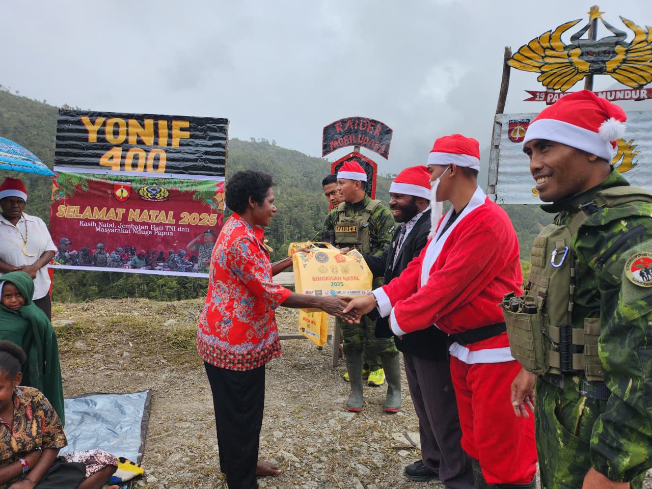 NDUGA, iNewsSemarang.id — Satgas Yonif 400/Banteng Raiders menggelar kegiatan pembagian bingkisan Natal kepada masyarakat Papua dalam momentum Hari Raya Natal 2025 di Papua Pegunungan.