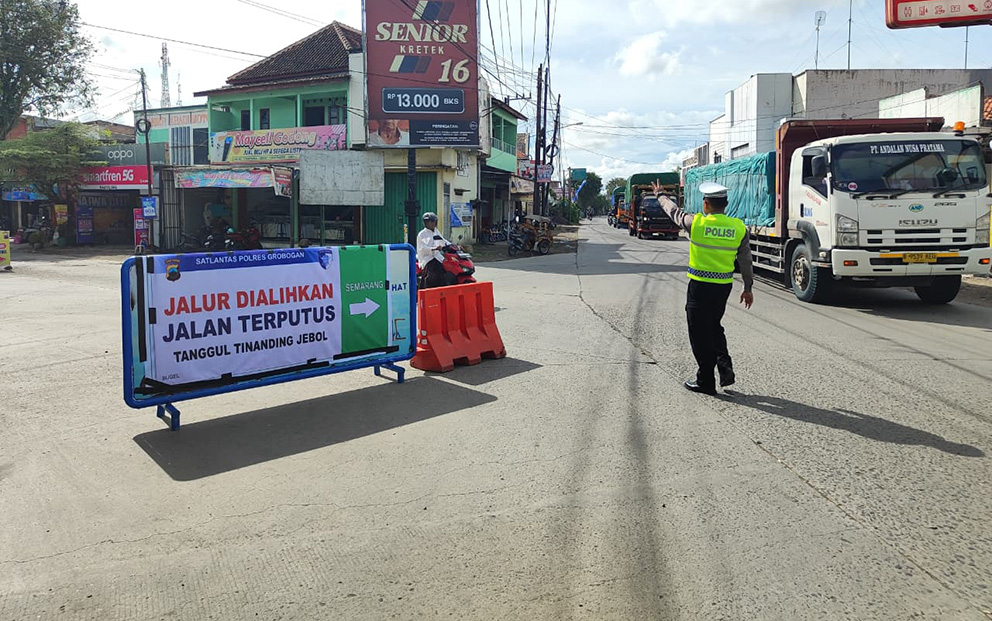 Untuk memastikan mobilitas masyarakat tetap berjalan, petugas kepolisian dari Polres Grobogan bergerak cepat melakukan rekayasa lalu lintas.