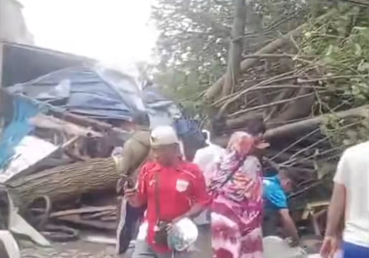Pohon tumbang juga terjadi di kawasan Jalan Kokrosono hinga menimpa beberapa tenda PKL, belum diketahui apakah ada korban atau tidak.